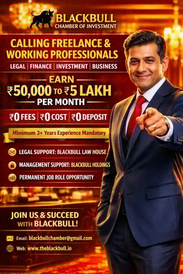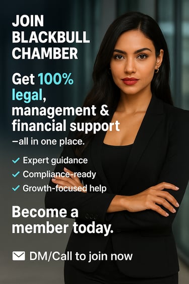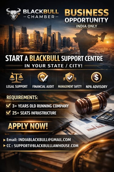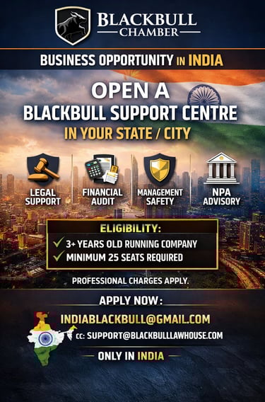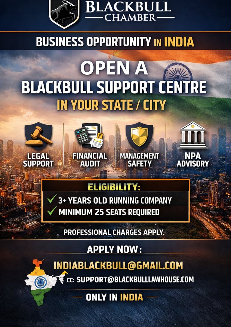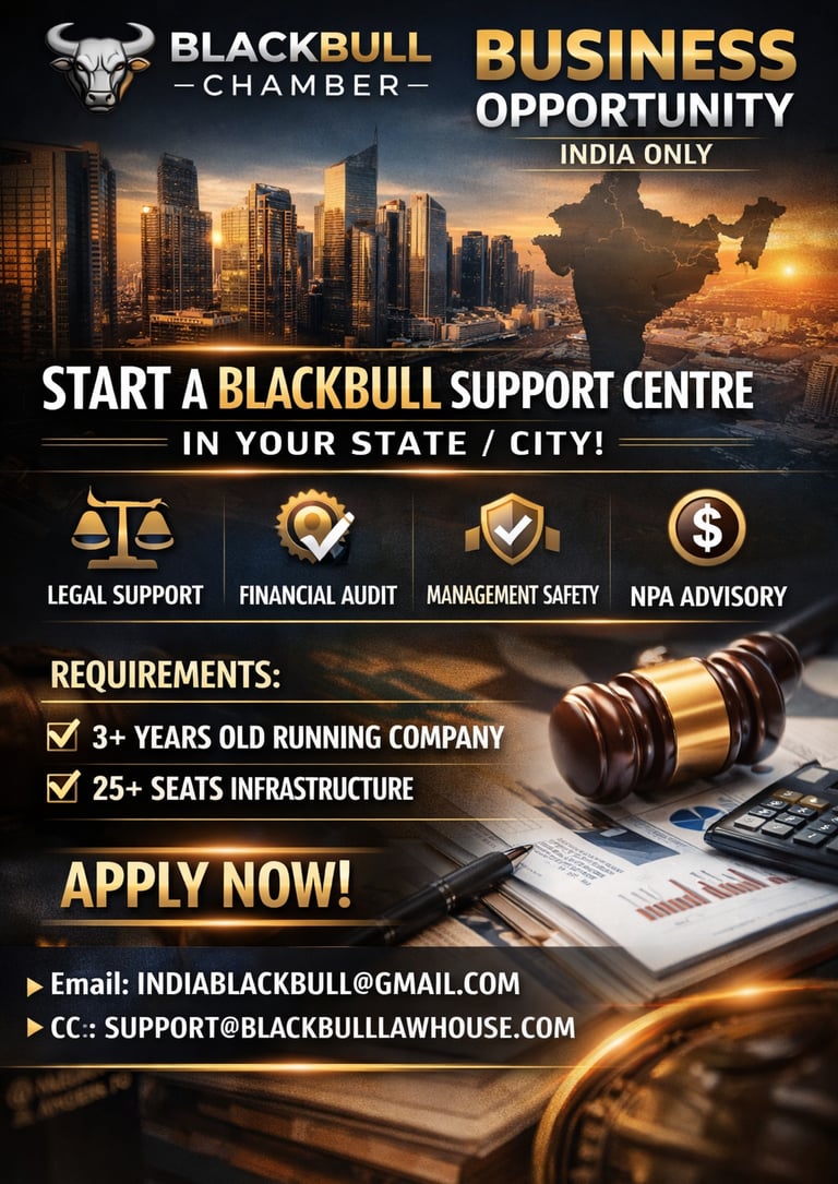 BlackBull Chamber’s “Support Centre” business opportunity is available only within India and is intended for eligible businesses that meet the stated requirements, including a minimum 3-year-old running company and minimum 25-seat infrastructure. Information provided in this advertisement and on this website is for general informational purposes only and does not constitute legal advice, financial advice, audit certification, regulatory approval, or a guarantee of business results, income, or outcomes. Any reference to “end-to-end protection” describes the scope of support services offered and should not be interpreted as an assurance against losses, disputes, penalties, or legal proceedings. Final eligibility, onboarding, scope of services, timelines, and commercial terms are subject to verification, documentation, due diligence, and a written agreement executed by the parties. Professional charges apply and will be communicated prior to engagement. BlackBull Chamber reserves the right to accept or reject applications at its sole discretion. For official communication, apply only via the stated email addresses.